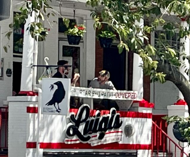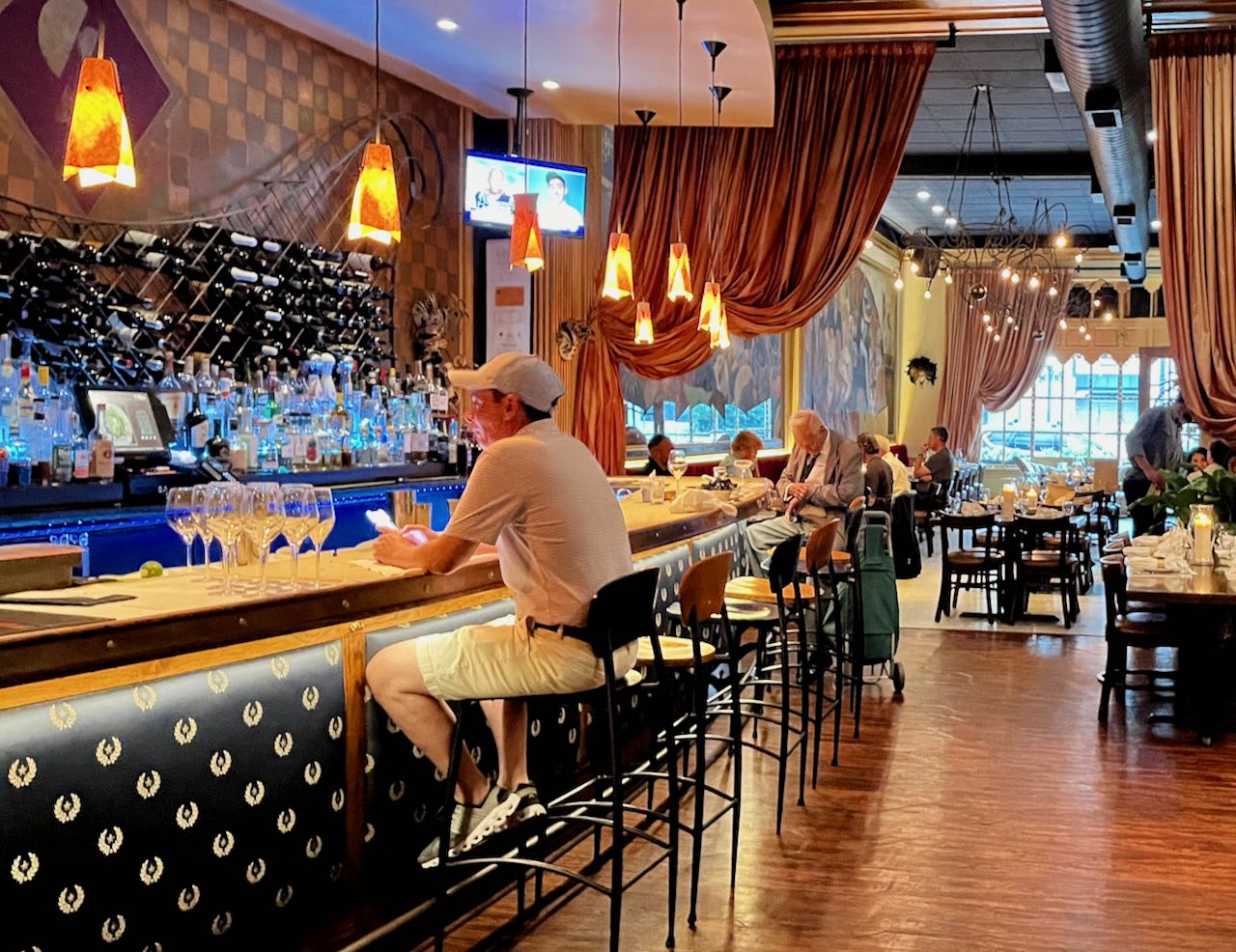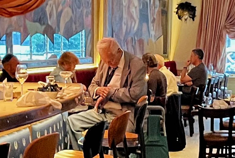I took the bicycle up into my room. Somewhat later I walked a few blocks to the Italian restaurant Sotto Sopra, on this Monday night about half full. I found a seat at the bar two spaces down from a colorful guy who looked at least ninety years old, staring at his pink cocktail glass. On this summer day he was perfectly dressed in a pressed suit and tie. He gave me menu recommendations.