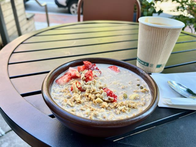 I looped around these neighborhoods, then cycling around Johns Hopkins University. Near the campus I stopped for a late breakfast at the coffee shop Bird in Hand. Refrigerator oatmeal was distinctive. I noted all the student types around me, many or most seemed From Southwhere Else. Other languages abounded. Elite universities clearly draw students from all over the world.