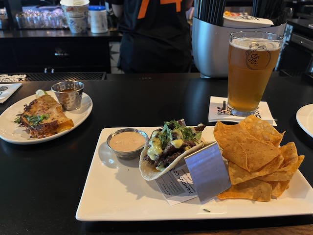 In hindsight I punted by not ordering the thirty-three dollar Maryland crab cake. I knew from New Orleans and elsewhere that crab has gotten expensive, especially if the meat is truly local and not from Southeast Asia. In my defense, I wasn’t all that hungry. I settled instead for the daily special, two five dollar tacos, one crab and one beefsteak.