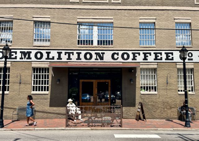I needed to get home. I bicycled the three or four miles back to my car and drove the five or six hours to Chapel Hill NC. Two thirds of the way home, twenty miles south of Richmond VA, I stopped at my favorite Baltimoresque Virginia town, one that gets almost no respect, Petersburg VA. For the road I ordered an oat mile latte, one pack sugar, at Petersburg’s Demolition Coffee. The guy in the white suit is an artwork.