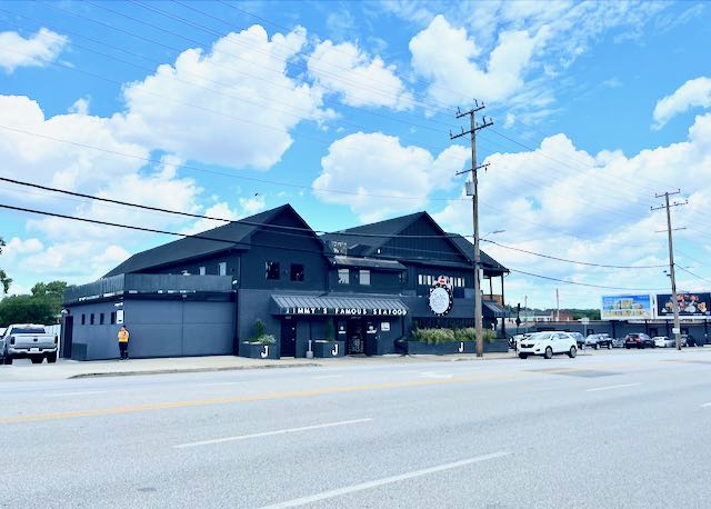 I had vaguely heard of suburban neighborhoods on the southeast side, especially Dundalk. This area was formerly the huge Bethlehem Steel plant. Cycling there was challenging, navigating numerous railroad tracks and underpasses. I discovered a sea of giant new warehouses, including Amazon. In the center of this industrial area I found Jimmy’s Famous Seafood.