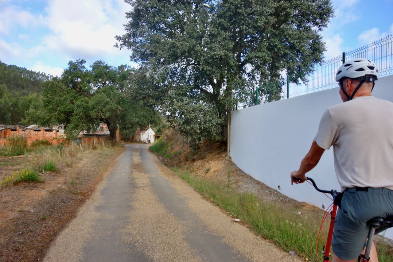 Alex did admit that his lodging ideas had been a little optimistic. By early afternoon we had already booked online for that evening the only hotel in a very small town called Santa Clara a Velha (“Saint Clara the Old”). The motel-like building was a difficult bike climb uphill to where it overlooked the town. We seemed to be the only guests. We later walked back down for dinner. There were only two bar/restaurants, and one was mostly just an add-on to the only grocery store. The other establishment was a very typical looking Portuguese bar with middle to older aged men hanging out in front, sipping beers, except it had signs for Thai food.