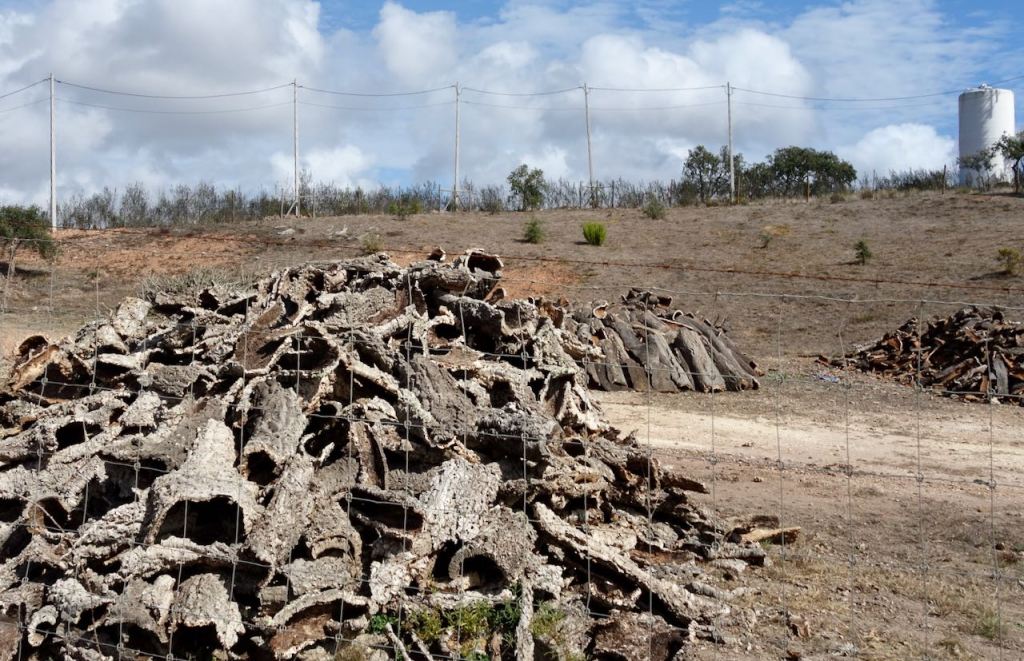After cork is stripped from the trees it is stacked in piles.