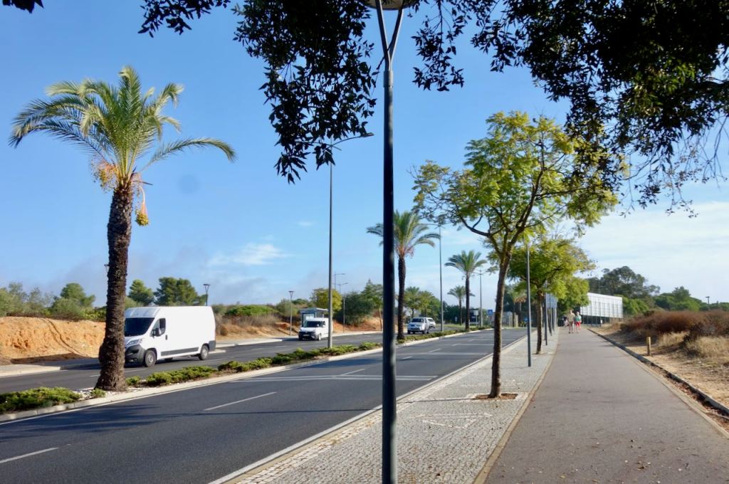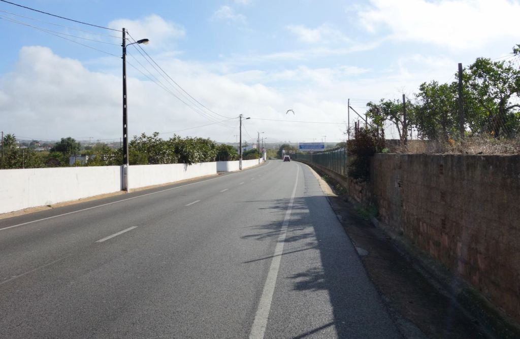 I skipped the partying and walked back to the hotel. Trying to sleep in my room it was not as difficult as I had feared. The next morning rain was predicted all day, but at 8:30 AM the sun came out temporarily. I dashed out, cycling east, trying to beat the weather. For a very brief stretch there was an actual bike path leaving Albufeira, then I had to cycle on a shoulder.
