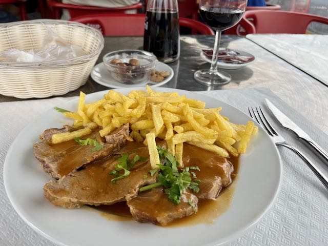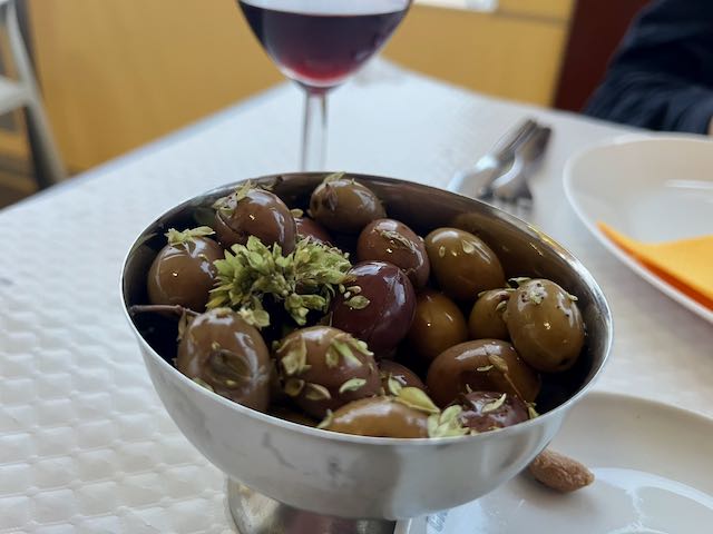 I sat down and chose a lunch entree, roast pork in gravy with half a liter of red wine, plus olives and bread.