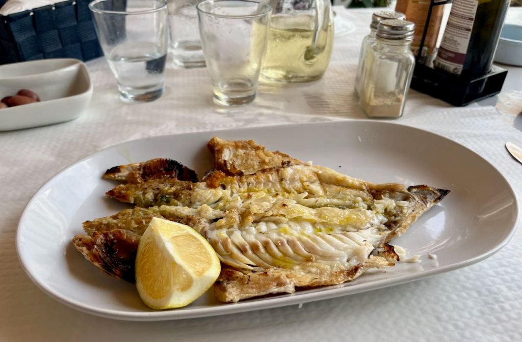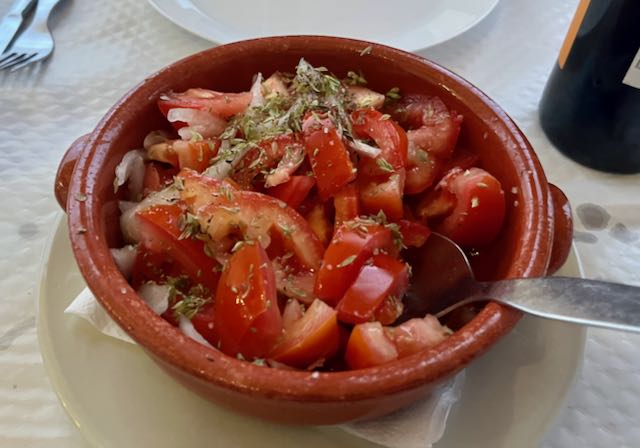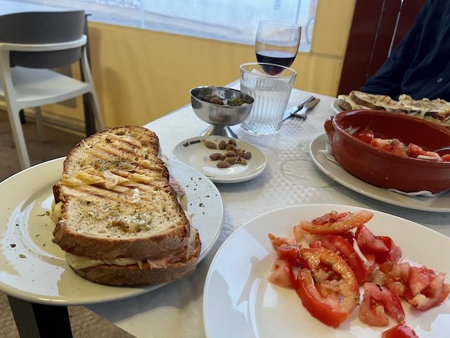 This Alentejo region of Portugal takes eating seriously! For “just” a grilled cheese that same bartender laid out a proper paper tablecloth and a bottle of local red wine. He gave us a dish of the obligatory olives, with fresh oregano artfully sprinkled on top. There was a beautiful salad of tomatoes and onions, also sprinkled with oregano. You would add one’s own dressing with the accompanying olive oil and vinegar.