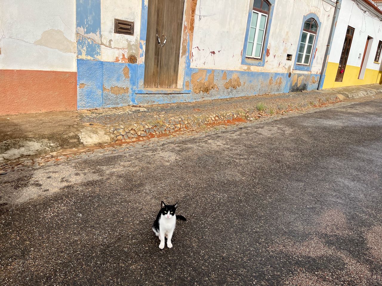 At noon we had a delicious meal at the same bar-restaurant. After lunch the rain had stopped, at least for a while. A cat watched us load up our bicycles on a street of Amoreiras-Gare.