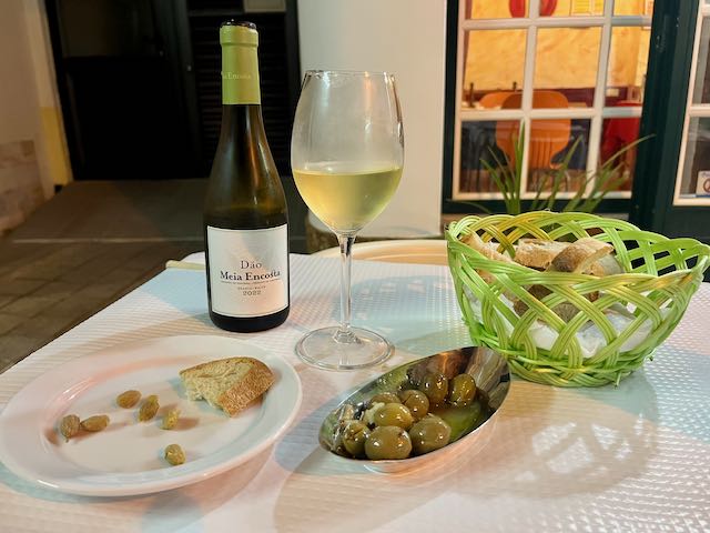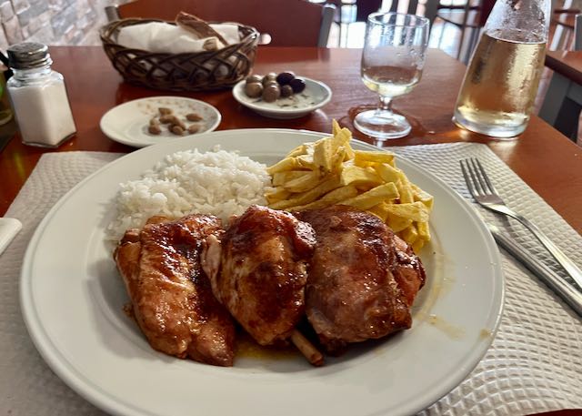 I asked for a seat on the porch but they said all those seats were already taken, even at this early hour. They seated me inside and I chose “pernas de frango no forno” (chicken legs from the oven) with a half liter of house white. It is very Portuguese that they serve both French fries and white rice. Notice the bread and olives.