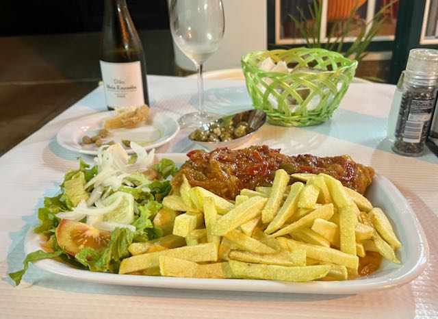 I had a wonderful meal that evening around the corner at Retiro de Adelino. Bacalhau a casa (codfish of the house) had been fried and covered with a tomato red pepper sauce and included salad and fries. I added a half size bottle of local white wine, olives, and bread.