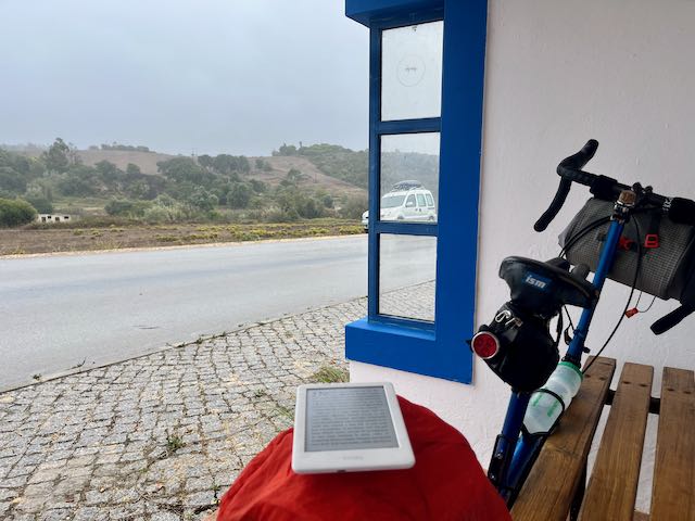 My route roughly paralleled the Atlantic coast but stayed a few miles inland. I zig-zagged to stay off the main highway. There was an hour or two of clear weather before an unexpected fifteen minute downpour. Most of Portugal does not have fancy rural bus shelters but luckily I found the perfect spot to duck from the weather, bicycle included! I read my book on the Kindle.