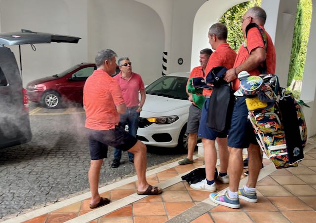 I packed up to bicycle to my next town. These British guys getting in a van, all in matching golf shirts.