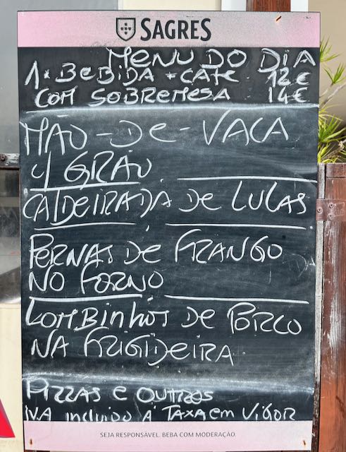 The next major town along the coast is Portimão. I expected a touristy scene in its historic center but a mile out of town I cycled past a restaurant too good to pass up, even though I was not ready for lunch. Like the French, the Portuguese seem ritualized about mealtimes. Restaurants here open at 12:00 PM but do not seem to fill up until 1:00 PM, and then close at 2:00 or 2:30. At this place at 12:05 locals were already eating. Twelve euro meal, fourteen with dessert, including drink (wine) and coffee.