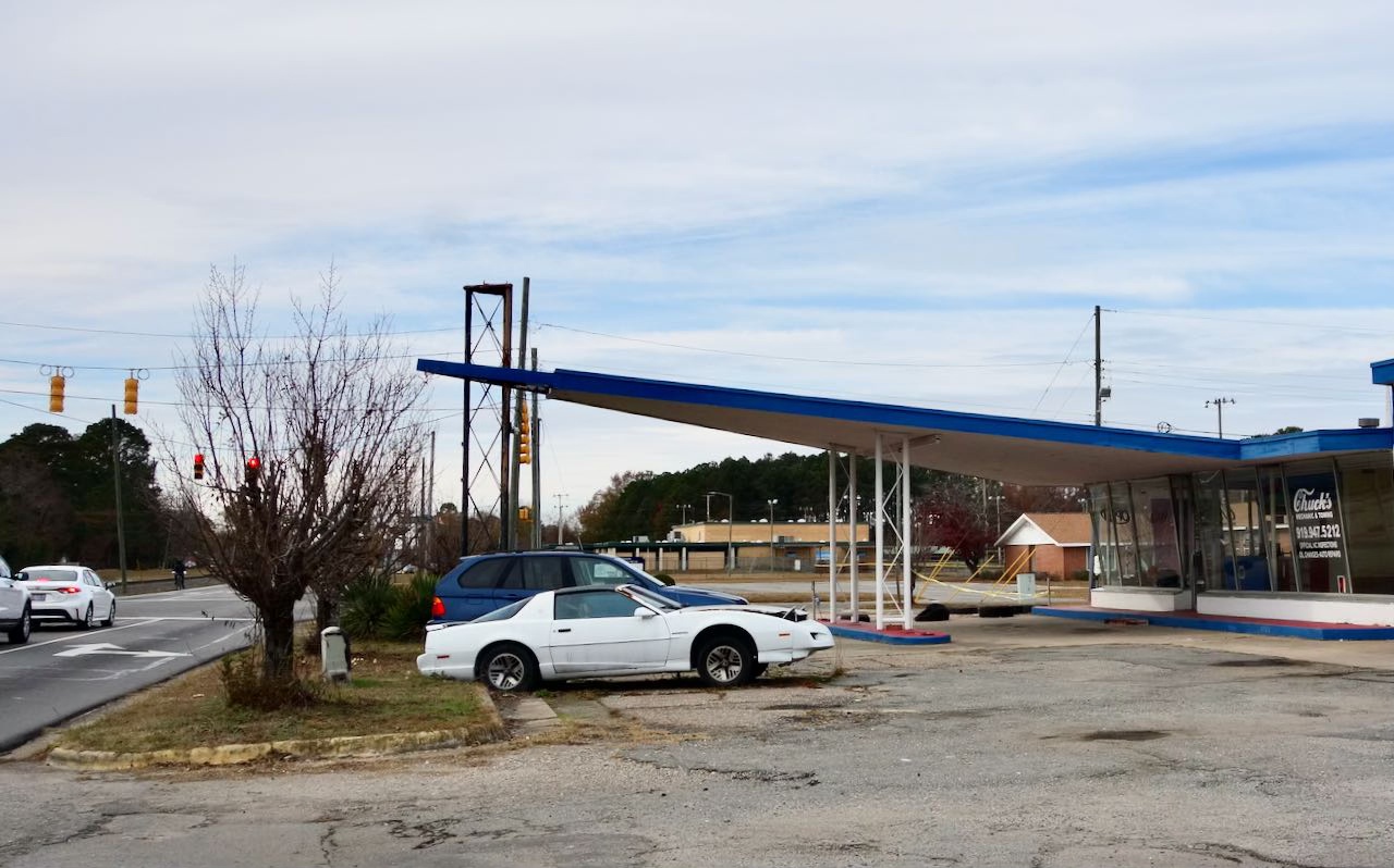 Goldsboro is home of Seymour Johnson Air Force Base. While some may call Goldsboro a “town” when arriving by bicycle it felt like a big city. I must have chosen the wrong highway as I cycled in scary heavy traffic through miles of depressing rundown commercial sprawl and semi-abandoned strip malls. A beat-up modernist ex-gas station was perhaps the best looking thing in that stretch.