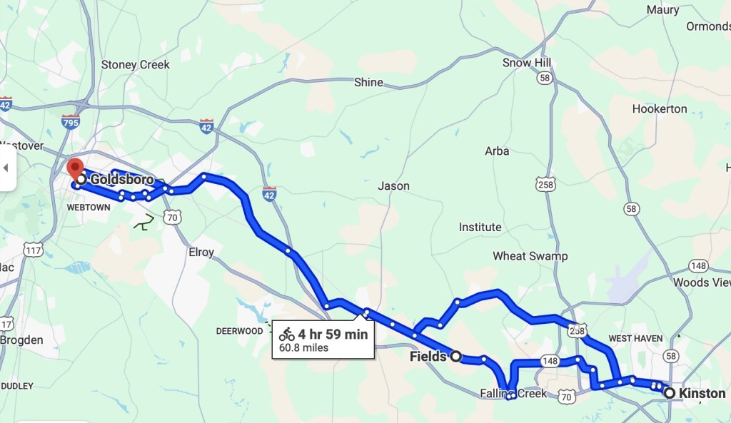 With Tootie’s Cannondale bicycle in the back because my Bike Friday was in the shop, on a Saturday morning I drove our Ford Escape Hybrid ninety miles from our home in Chapel Hill NC to Goldsboro NC. These maps show the bike ride I would take.