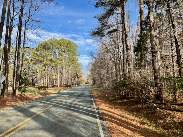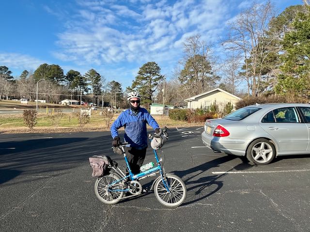 It was cold outside. Tootie had a dermatologist’s appointment in Pittsboro NC at 9:15 AM on a Thursday. Why not get a lift from her and bike back to Chapel Hill? With the Bike Friday in the back of our Ford Escape Hybrid we drove the sixteen miles down to Pittsboro.
