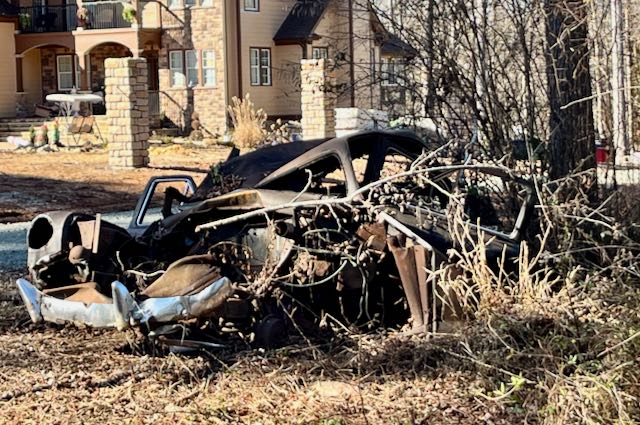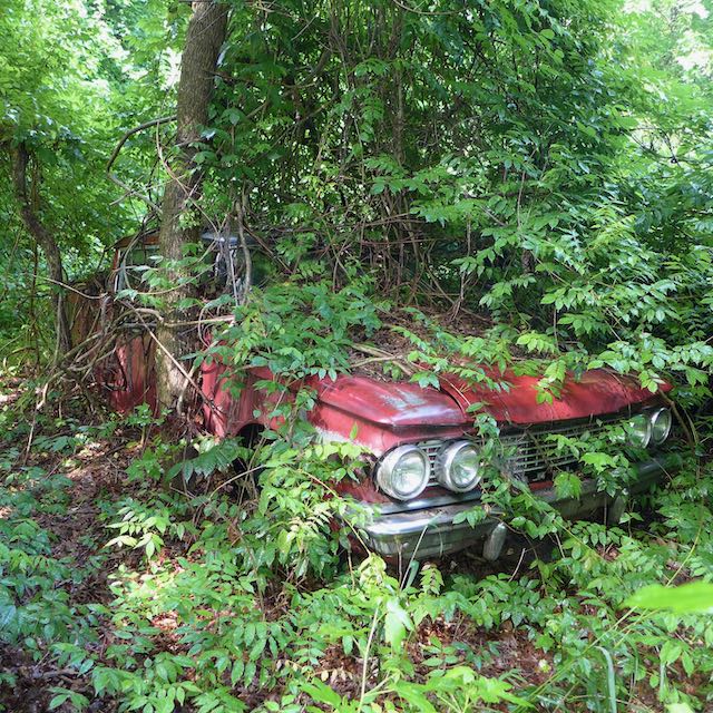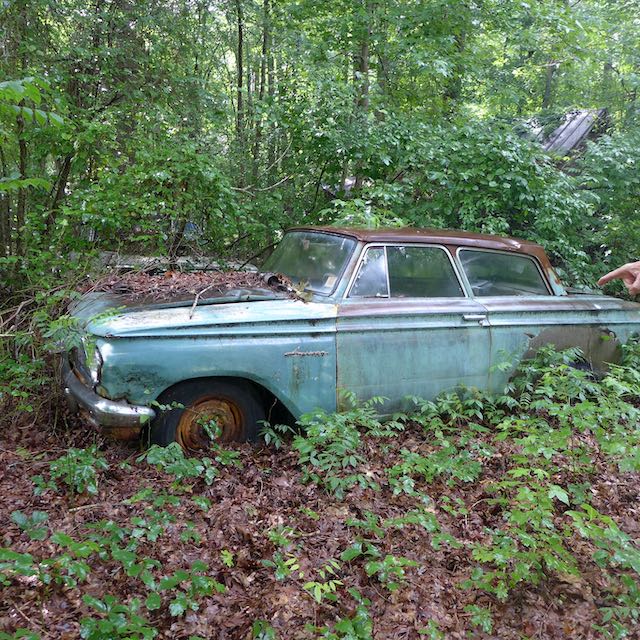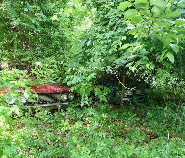 Cycling down Jones Ferry Road, on the right I passed one of those artsy driveways. Down that dirt road a few years ago my friend Whit showed me where a guy had collected cars in the woods, exclusively 1960’s Ramblers, maybe a dozen of them. You needed to bushwhack through a few hundred yards of the bramble. These photos are from 2013. I guess these Ramblers are still out here, even more consumed by vegetation.