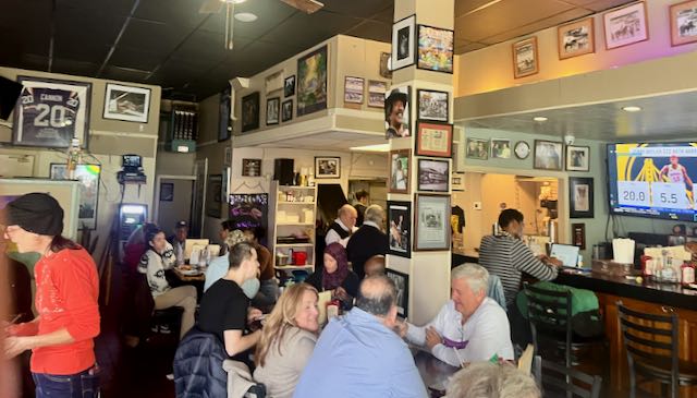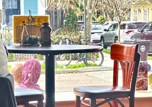 In very Italian-American fashion, there are framed photos of celebrities on the wall, including the owner (one assumes) shaking hands with the Pope (one assumes.). I cannot avoid staring at people. For lunch on a Monday the crowd included a Black guy with effeminate mannerisms, a young woman in a headscarf, and next to me at the bar, a heavyset White guy in hunting cammo who was emptying the salt shaker into his (to my taste) already too salty gumbo, .