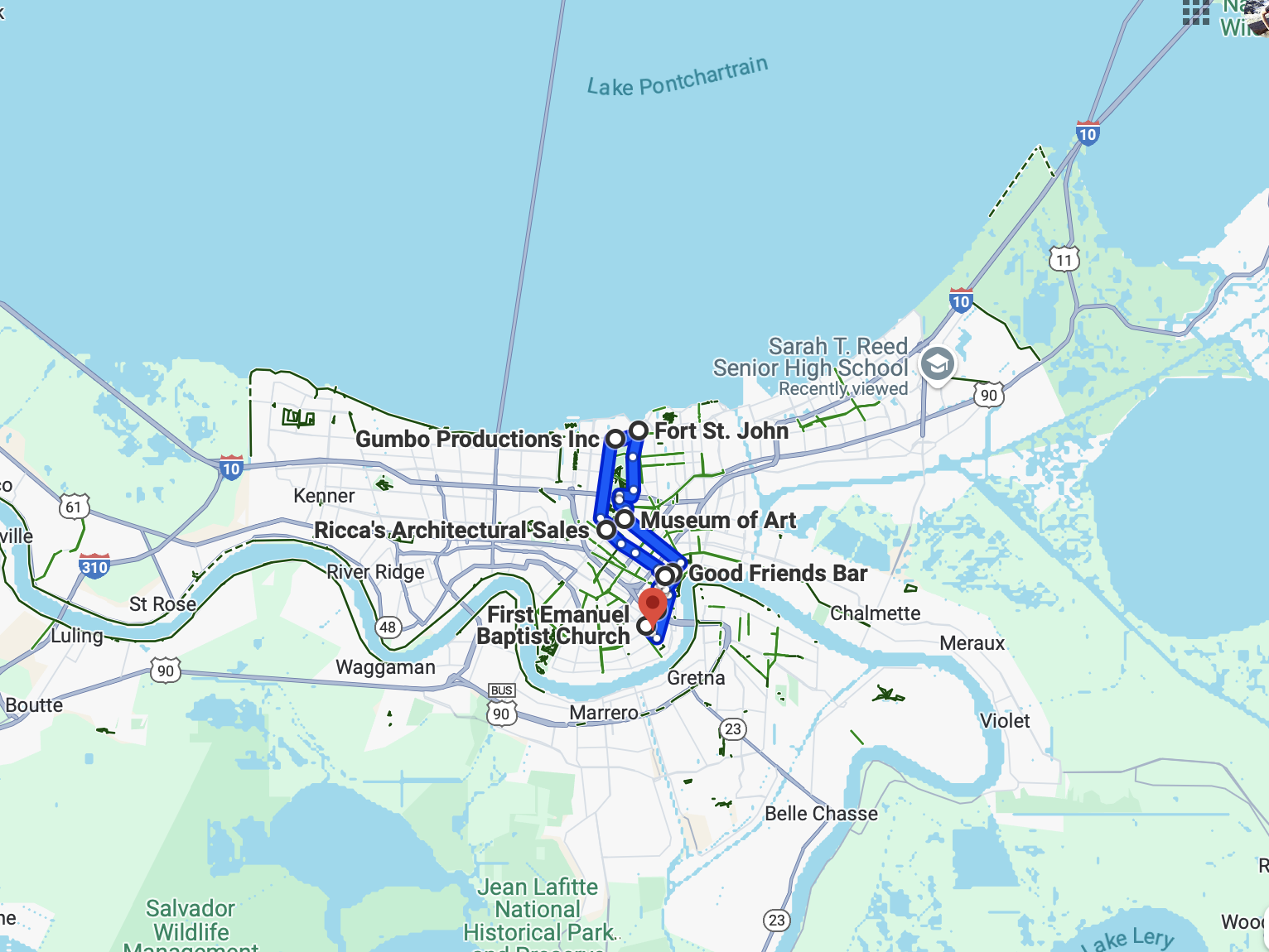 Along the lakefront side of City Park the path parallels a street that until about ten years ago was called Robert E Lee Blvd. Now it is Allen Toussaint Blvd, named after the New Orleanian who produced and wrote hits in the early sixties, including “Mother in Law” and “Working in a Coal Mine.” The bike path ends near the art museum at the foot of Esplanade Avenue. I usually cycle almost the entire length of Esplanade Avenue, all the way to the French Quarter, before taking a right on Dauphine Street. I can follow Dauphine through the Quarter and across Canal Street, where it changes its name to Baronne Street. Following Baronne through downtown and underneath the Expressway, I take a left somewhere around Melpomene Street, leading me the few blocks to my home.