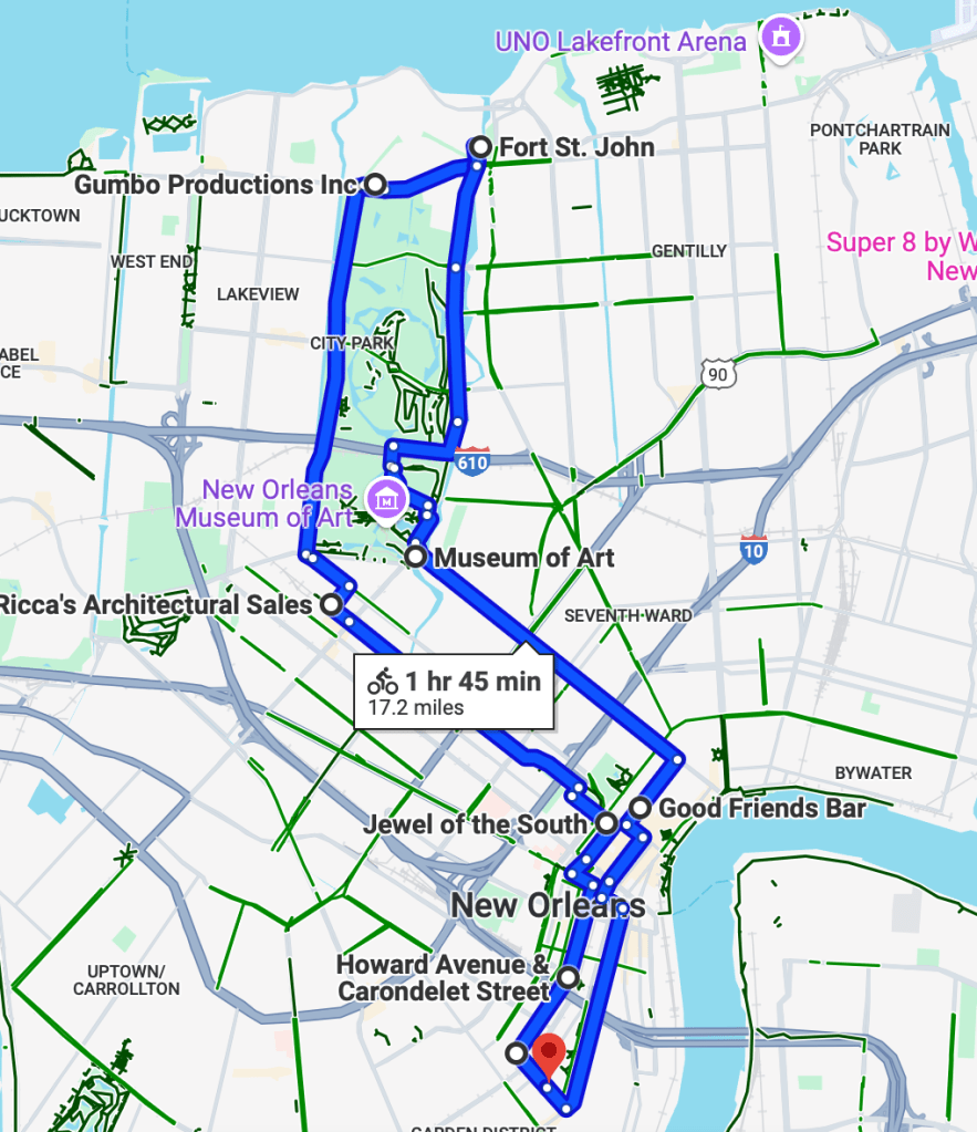 New Orleans is an island of urbanity surrounded by wetlands on almost all sides. Except for extended bike rides on the levees, most longer bike rides still heavily involve city streets.