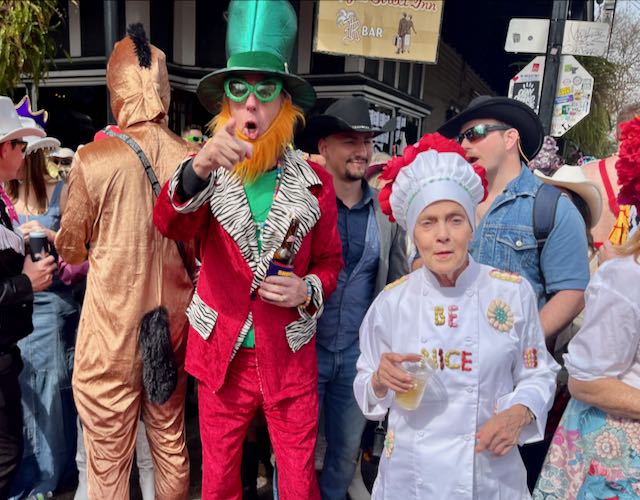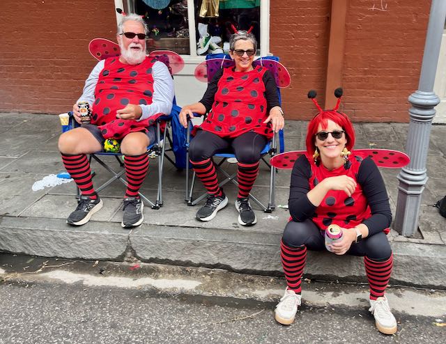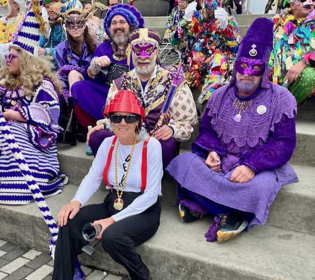 Mardi Gras Day celebrations generally start early and end early. Predicted thunderstorms were on the way and our Mardi Gras would end by 2:00 PM. Near the Riverwalk, on the way back to our bicycles Tootie sat down with some random people.