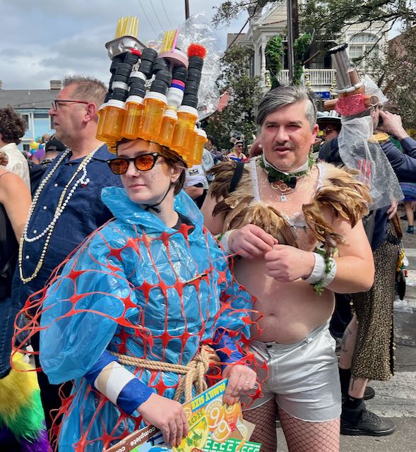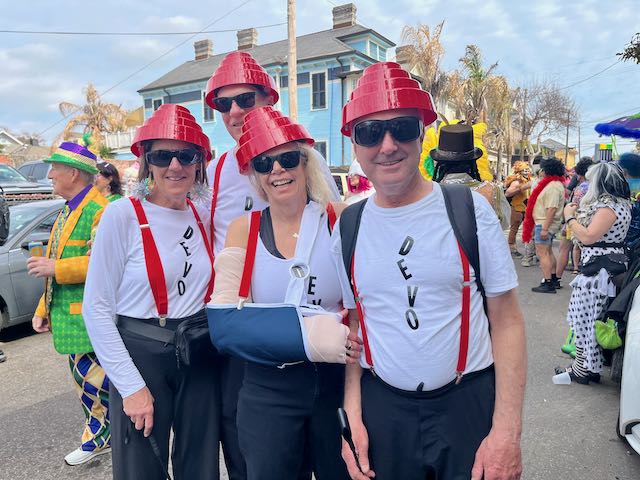 During Mardi Gras the fading local lingo is that you “mask” for Mardi Gras, not “dress up.” We had masked as Devo two years earlier and reprised this role. Gillian had broken her arm in a fall the night before but she soldiered on.