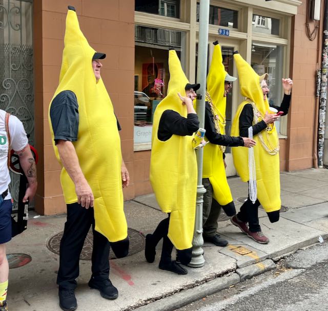 On that Fat Tuesday supposedly a million people crowd the streets all over the city. Parades on St. Charles Avenue in Uptown continue all day. Tootie and I looked instead to go two miles downtown to the French Quarter. Car travel was almost impossible. Most assume that the only way to get there is to walk. Or ride a bicycle. We rode our two 1970’s Schwinns and locked them on the edge of the Quarter at bike racks beneath the Canal Place shopping mall. We met our friends Lyman and Gillian on Decatur Street.