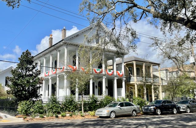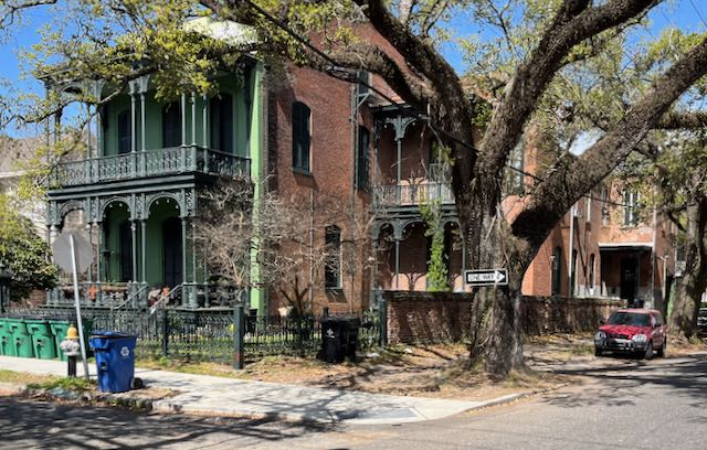 Washington Avenue now heads in a different cultural direction. One block beyond St. Charles Avenue, at the corner of Carondelet and Washington I speculate the real estate value of this lovely antebellum mansion is greatly reduced because it is on the “wrong” side of St. Charles Avenue.