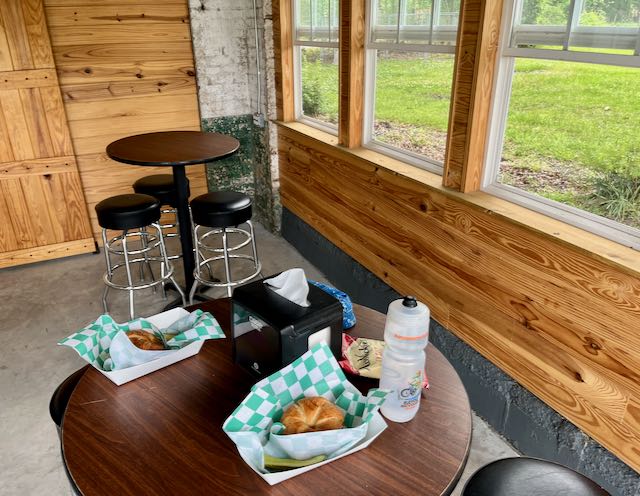 We found a fetching cafe called Bittersweet Crossroads, built out of a 1950’s gas station and nowhere near a four lane highway. Their sandwiches are prepared to order. Lunch! There were tables in a semi-outdoor space fashioned from one of the garage bays. Threatening storm clouds rumbled in the distance.