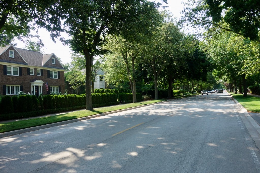 The beachfront path ends around Evanston and I then cycled northward along city streets. Once leaving the Chicago city limits I cycled for nearly twenty miles along the near-lakefront Sheridan Road through Evanston to Wilmette to Winnetka to Glencoe to Braeside to Highland Park. Many of these wealthy and exclusive close-in suburbs brazenly describe themselves as “villages.”