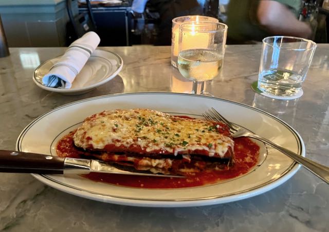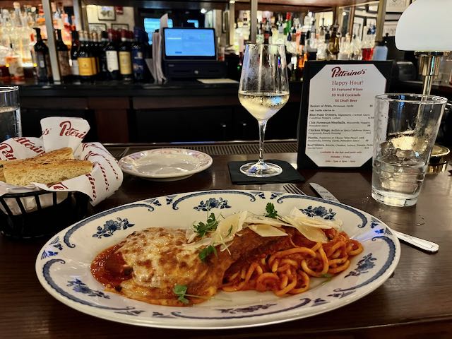 Dinner in a big city on short notice with no reservations was surprisingly easy. The touristy looking caricature of an Italian restaurant Pittino’s half a block from my hotel was not only delicious and fairly priced, but had quite the scene of pre-theater locals at the bar with a gregarioius but professional bartender. Eggplant parmesan, once again.