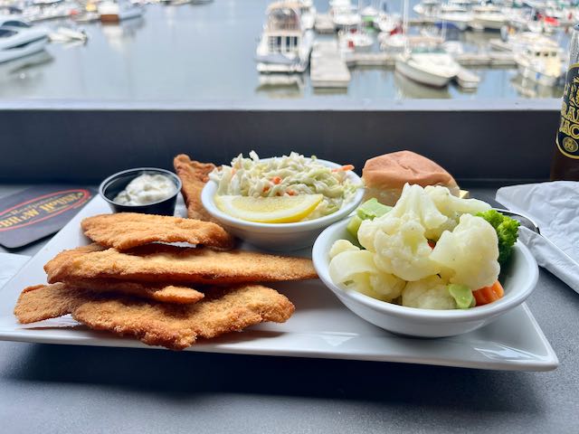 Racine has a yacht harbor by its downtown and I had lunch at the one waterfront restaurant. Fried lake perch with choice of side. I chose “California vegetables.”