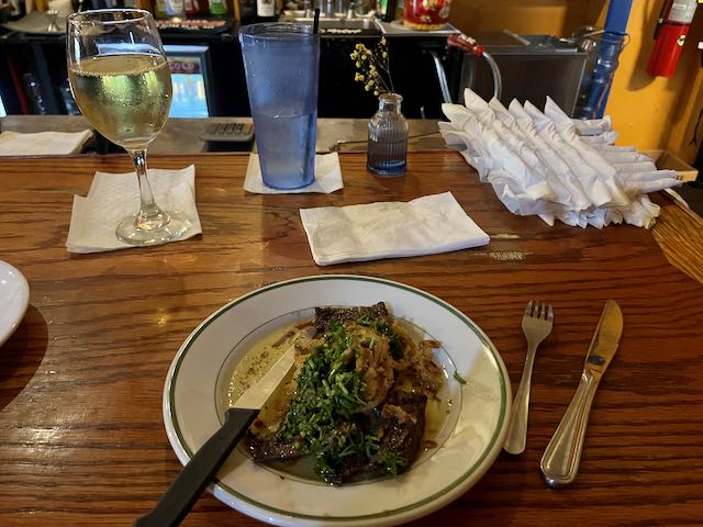Downtown Highland Park is lined with cutesy shops for one’s granddaughter but I did locate DeNucci’s, an apparent upscale temple to red sauce Italian. On this Monday night there was a line for a table but I snagged a seat at the bar.