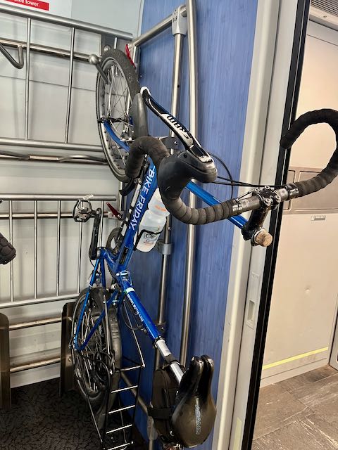 Most of the Amtrak trains I have ridden in the past thirty years consist of Budd Amfleet coaches built in the 1970’s. This Milwaukee – Chicago Hiawatha train had the new Siemens Venture train sets designed in Europe. The designated spot to hang a bicycle is clunky but usable.