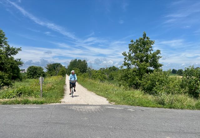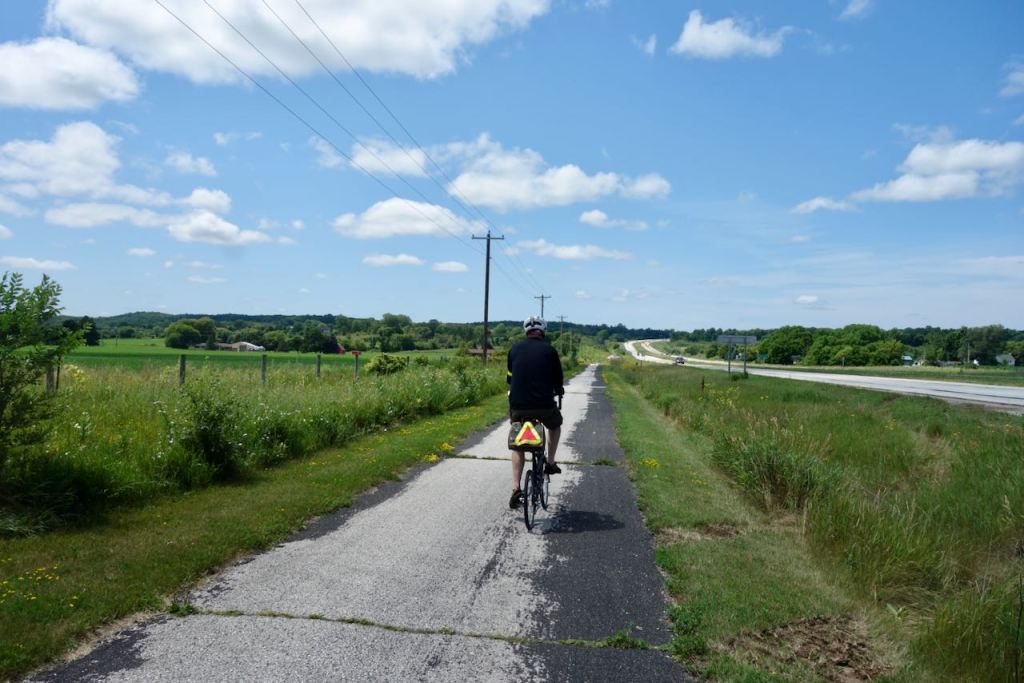 The trail continued through exurbs for thirteen miles but ultimately we found ourselves cycling west on country roads.