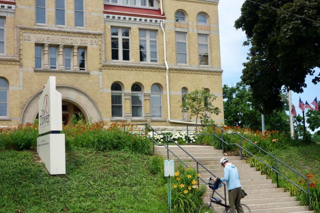 The next morning we cycled off into Wisconsin. Just a few blocks from our Airbnb Lyman insisted we stop at the circa 1889 courthouse in West Bend WI. His work as an architect in Texas had been in historic preservation of courthouses.