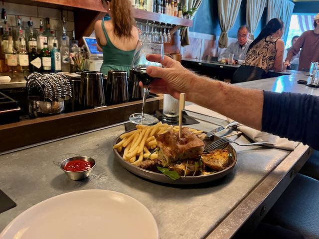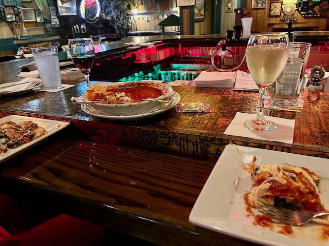 They didn’t have eggplant parmesan but our split of a spinach lasagna was satisfying. I am sure I broke all sorts of culinary rules by washing it down with New Zealand Sauvignon Blanc. Here in working class America they give you a big pour.