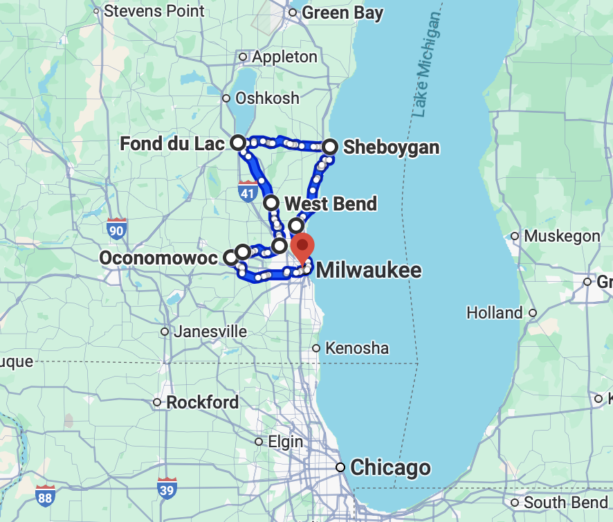 We set out that day for Sheboygan WI, forty something miles from Cedarburg and sixty something miles north of Milwaukee. This is a map of our entire six day long bike ride in Wisconsin.