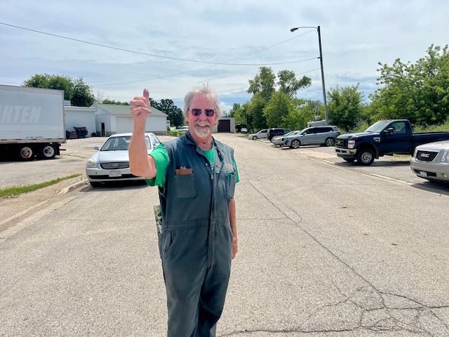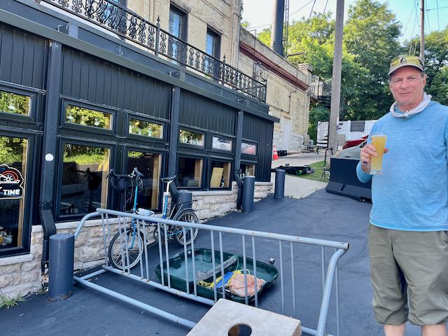 Lyman and I met at the Milwaukee airport, both of us with Bike Fridays in a suitcase. We are spoiled as we now insist on separate rooms even though hotels in America have gotten seriously expensive. Two hundred dollars often seems the norm, so it bears to shop aggressively. For the LAST night of this trip, I had reserved a lower cost two bedroom Airbnb in an industrial area near downtown Milwaukee, atop a brick Victorian structure on a hill that also houses a bar/restaurant called Sobelman’s. The owners had agreed to watch our bicycle suitcases for six days. On this first day we Ubered from the airport to Sobelman’s around two in the afternoon. We found a shady spot on the sidewalk across the street and put our bicycles together.