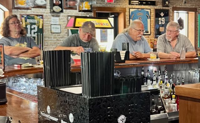 There are subdivisions popping up thirty miles west of downtown Milwaukee. Even further west our day’s destination, the lakefront town Oconomowoc WI (population 18,000) seems to have been a resort for many years but there are hardly any hotels . We were still looking when we pulled into town in the later afternoon. We found a spot for an outdoor beer and passed these people at the bar.