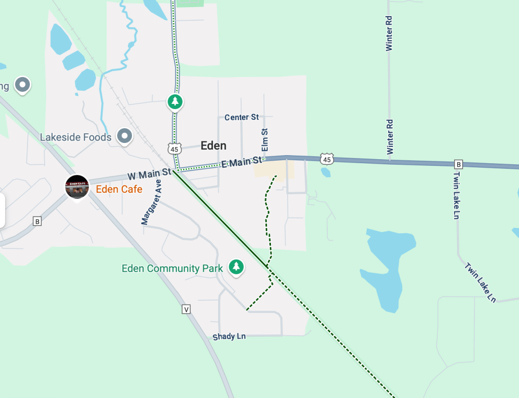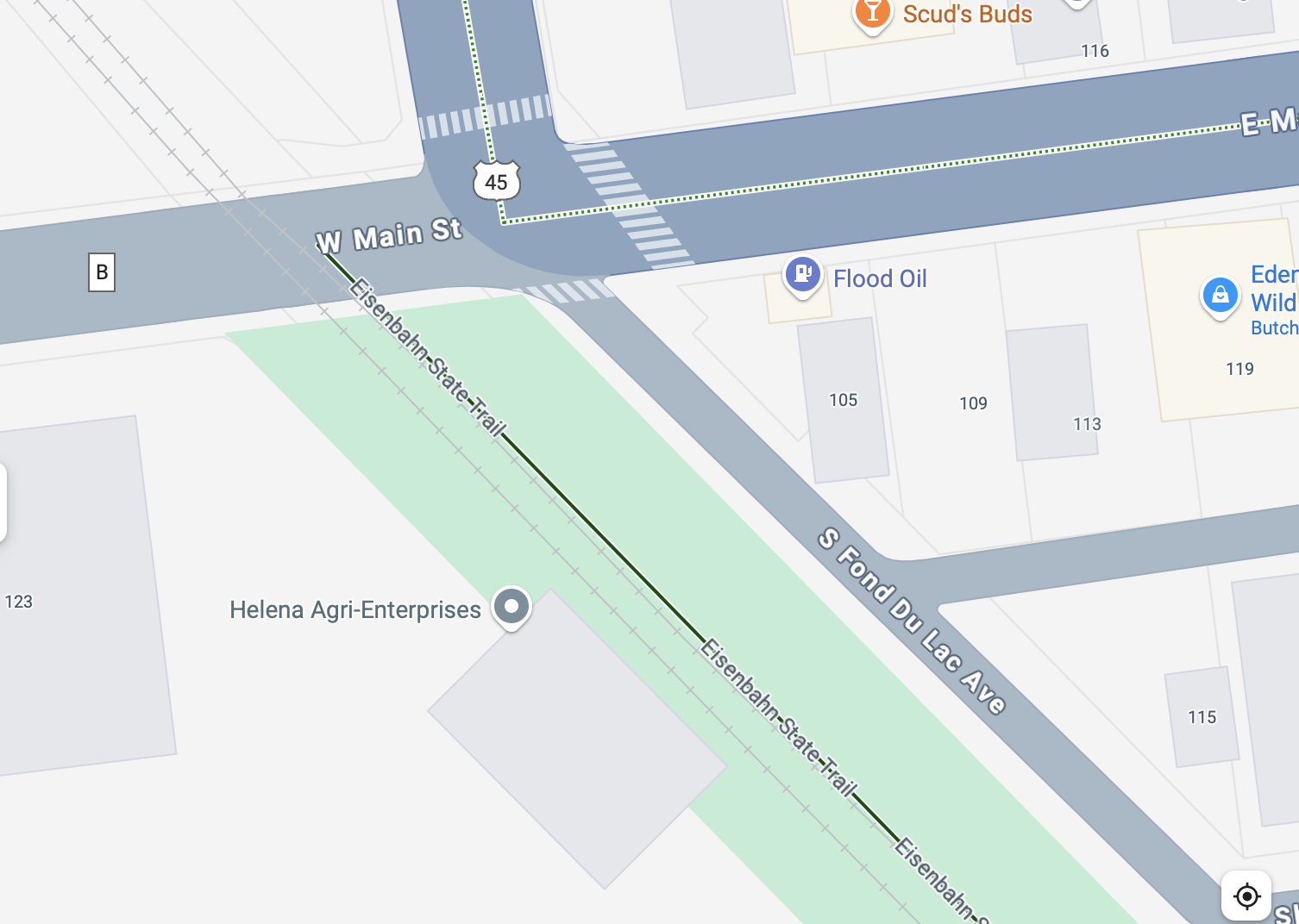 Eden WI is barely a town, just a settlement of a few hundred people. Lyman wanted a Gatorade for the thirty mile ride to come, and he looked into a little mini-mart near the corner of Main Street and US45 but it had gone out of business. The Google Map at the point we stood was very specific. This should be the start of the Eisenbahn State Trail! (This is a zoom-in from the map above.)