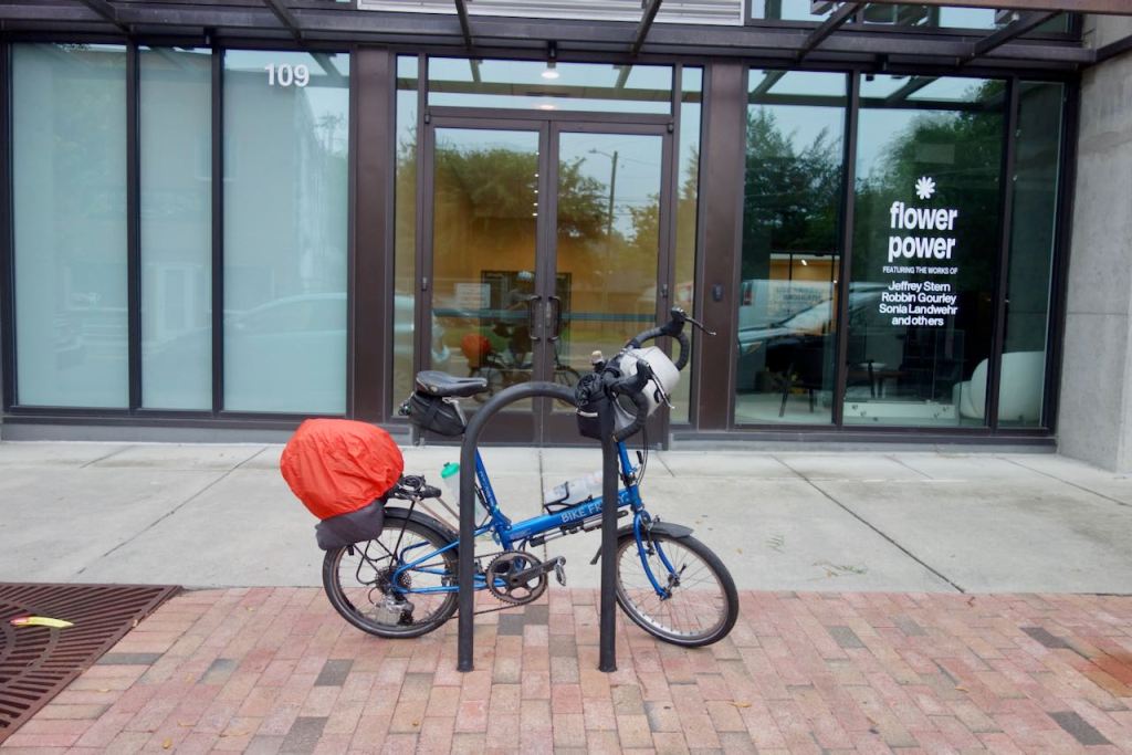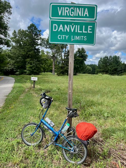 I have bicycled around Danville VA several times over the years, admiring its old buildings and taking photographs. Danville is also on Amtrak and I could go north from there by train. I had never cycled in one day the close to seventy hilly miles from Chapel Hill NC to Danville; a bit of a stretch for someone who just celebrated his seventieth birthday. This past Tuesday the weather looked promising. Here in the South in the summer I prefer cycling in drizzly light rain to intense sunny heat. I put the plastic fenders on my Bike Friday and threw caution to the wind; leaving from our condo building before eight in the morning. My rear trunk luggage bag is not waterproof unless you add the orange rain cover.