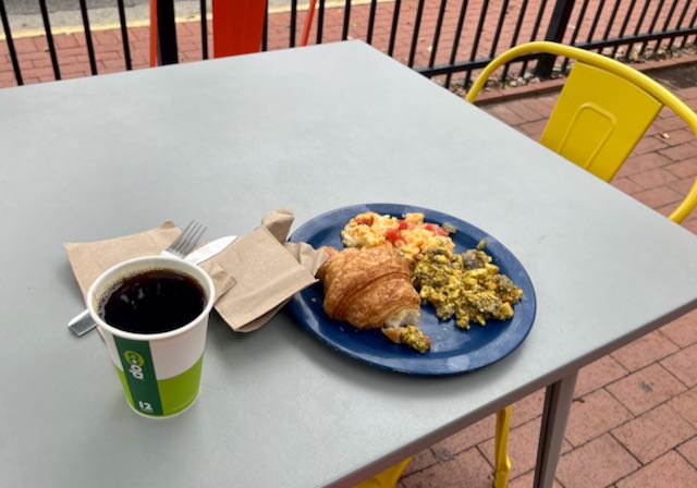 I live near Weaver Street Market’s original Carrboro location on Weaver Street and shop there nearly every day. Three other Weaver Street Markets have opened in the Raleigh/Durham area including Hillsborough. The crowd there seemed even more hippie-dippie than Carrboro. From the breakfast bar I chose Mexican scrambled eggs (“migas”) plus spicy tofu mushroom scramble and a croissant. Coffee.