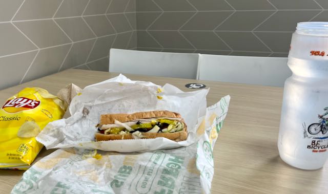 Out on the highway I found Subway in a strip mall, ordering my usual; turkey on 9-grain wheat, fully dressed but light mayonnaise, yellow peppers.