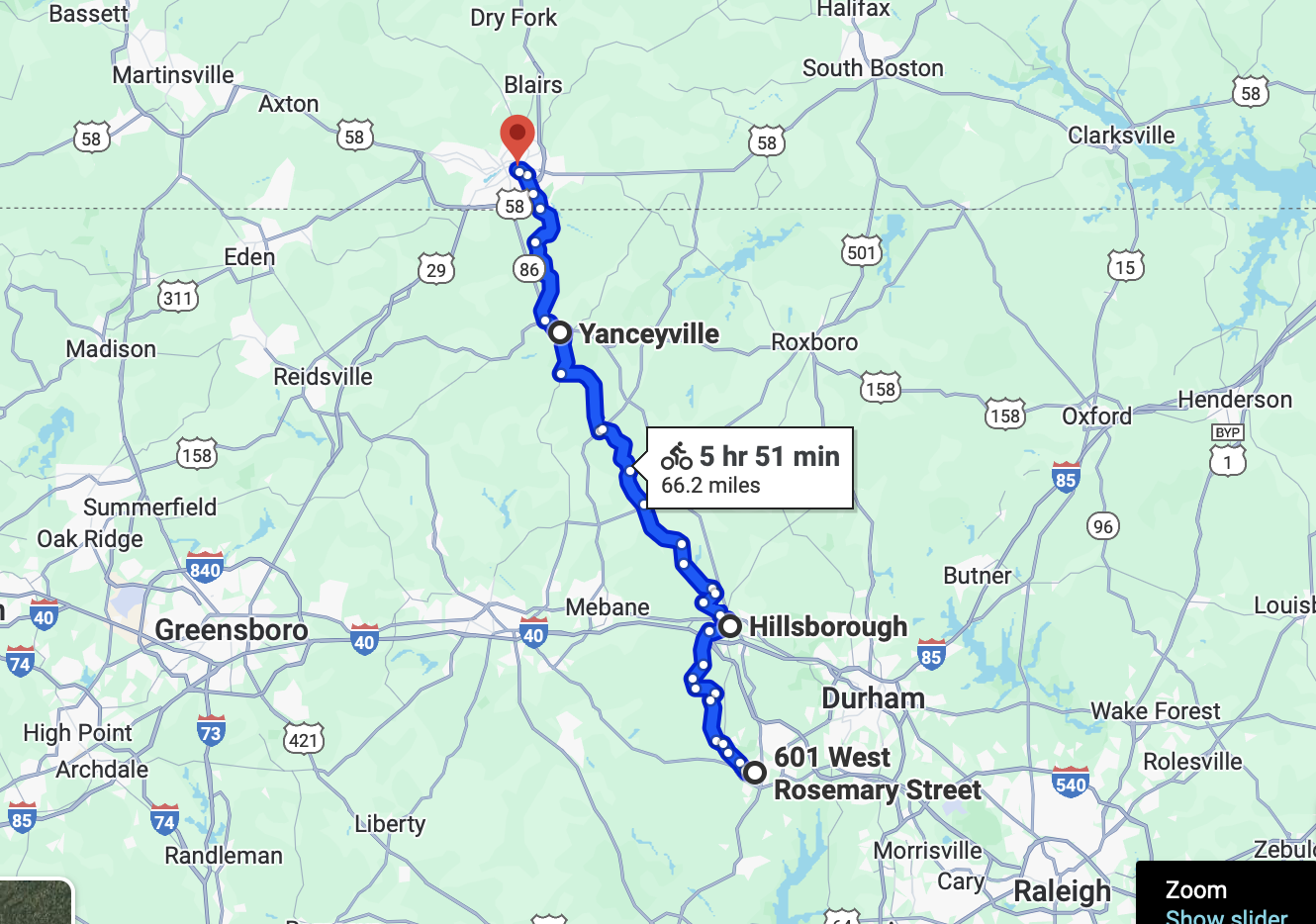 This day’s ride would be broken into three unequal sections: fourteen miles Chapel Hill to Hillsborough; thirty-six miles Hillsborough to Yanceyville, and sixteen miles Yanceyville to Danville.