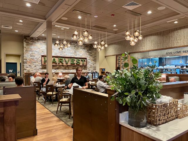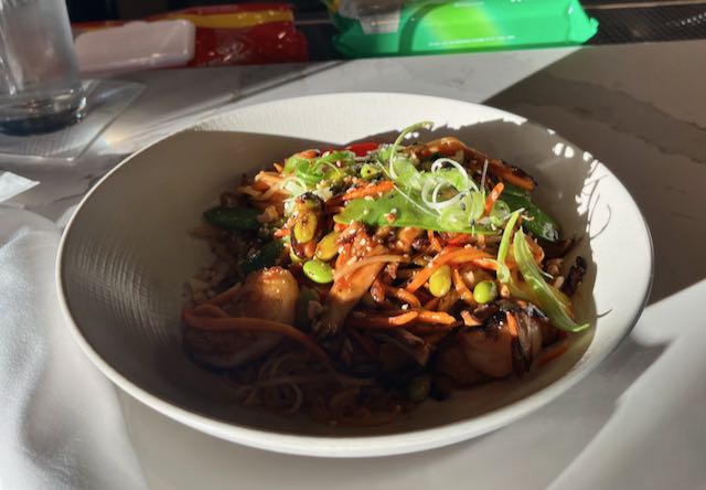 I treasure finding restaurants that are small, precious, and local. I suppose it’s counterintuitive that I found a really nice meal at the opposite, a regional suburban chain called Harvest Seasonal Grill, which advertises “farm to table.” Asian stir fried noodles with shrimp was perfectly seasoned and healthy feeling with lots of vegetables, and not all that expensive. Service at the bar was friendly and prompt on this Monday evening as I downed two glasses of New Zealand Sauvignon Blanc.