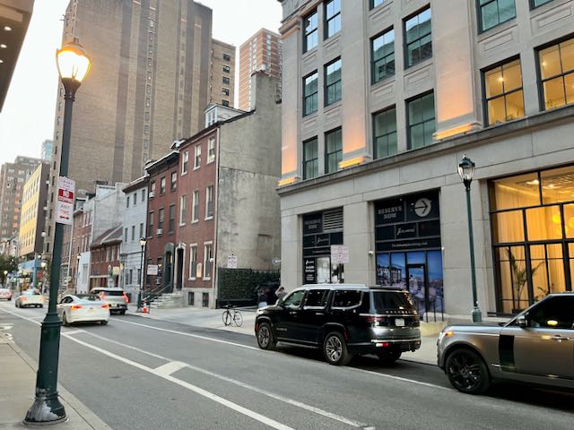 I flew up from Raleigh/Durham to PHL (only 55 minutes!) with my usual Bike Friday packed in its Samsonite suitcase. Philadelphia has one of America’s better airport-to-city light rail systems. The trains pull right up to the terminal. In Philadelphia “downtown” is “Center City.”
