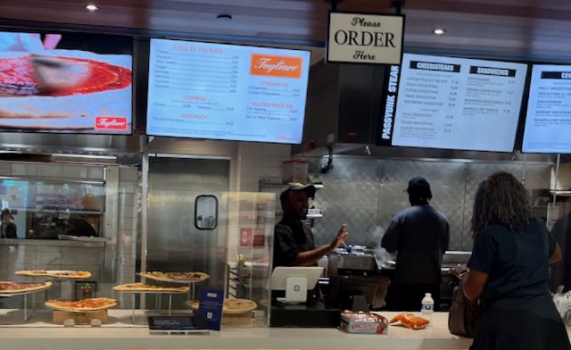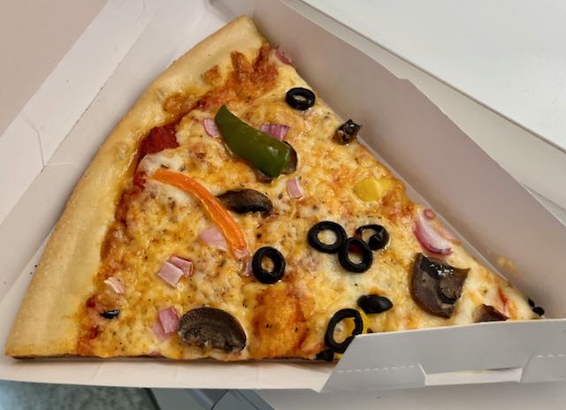 Airports generally have rip-off pricing for bad food. At PHL a genuine pizza place Tagliare’ offered a delicious slice of veggie pizza for seven dollars and change. Yes.