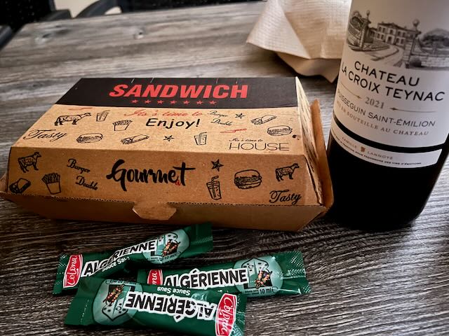 We now had food and we had wine. We walked ten minutes back to a table and chairs in the courtyard of our hotel, which we had all to ourselves. Paper coffee cups were procured from our rooms. Wine was poured. We opened our dinner boxes, which included little packets of a tasty sauce called Algerienne.