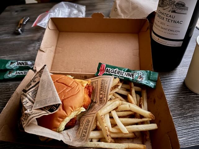 The most popular looking of the two alcohol-less fast food takeout places was the apparently locally owned “Smash&Crispy.” It was not much more than a windowed storefront open to the pedestrian street. Smash burgers seem to be a thing in southern France. In a combination of French and sign language, a friendly guy indicated the chicken smash was the best.