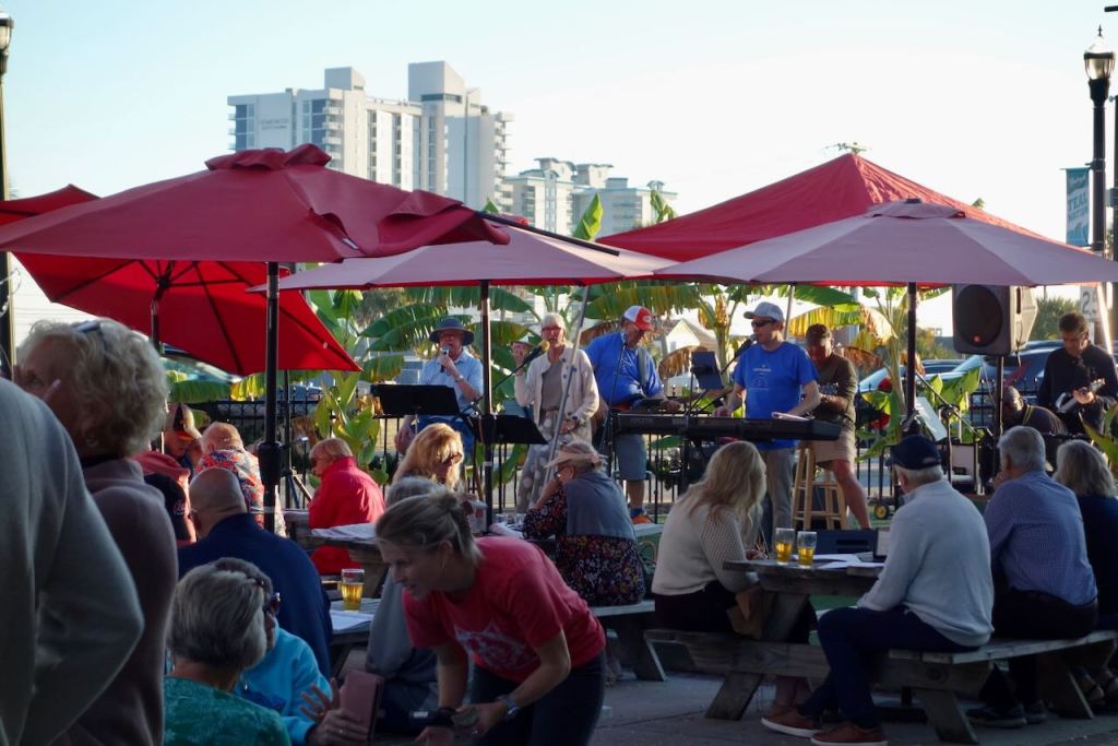Cycling into the older “downtown” of Myrtle Beach at about five in the afternoon, I looked on Google Maps for my usual cocktail hour standby, a local brewery. There indeed was one, only one. Cycling up to this beer garden there was a large crowd listening to a musical group playing modern Christian music. This was a first for me! Everyone seemed to know the songs but they were handing out singalong lyrics sheets. On a musical level the band was quite good. For whatever reason, I did not join in. I drank my draft IPA off to the side at the bar, watching the Atlanta Falcons on TV.
